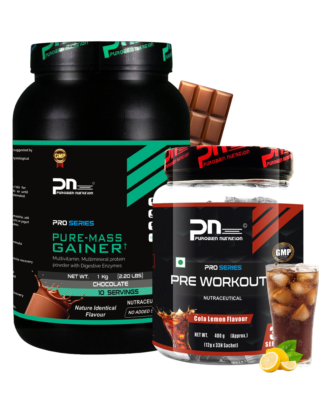 Build size & strength with Purobien Muscle Gain Stack Pre-Workout for energy + Mass Gainer for calorie-dense muscle growth.